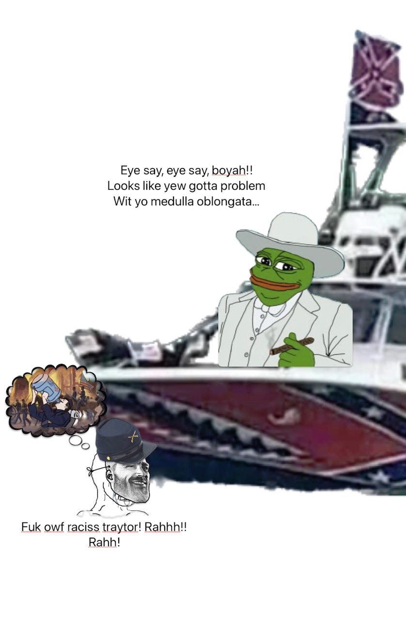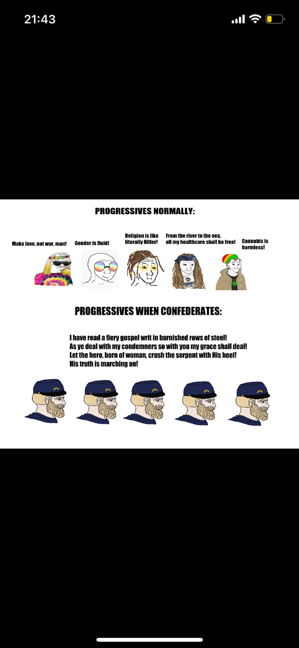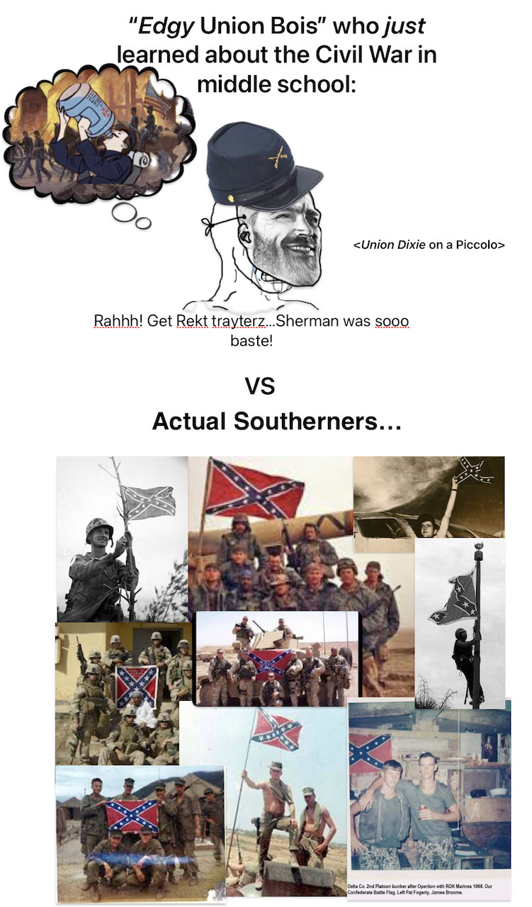 A terminally online person —more than likely born after 9/11, who either just learned about the “American Civil War*” for the first time in history class (if they are lucky and go to a school that does the bare minimum), or —more likely, just learned about it after going down a Wikipedia rabbit hole. These kids are naturally angsty, rebelious, and want to let out their frustrations on the world. Unfortunately, things that were considered “based” circa 2015-2016 like being a wehraboo that totally just likes the uniforms and tanks and nothing more…can now get you unpersonned from polite online society. So, how can one edgy boi of the 2020s properly vent their frustrations online by advocating for something morally and ethically reprehensible while also being seen as virtuous?
